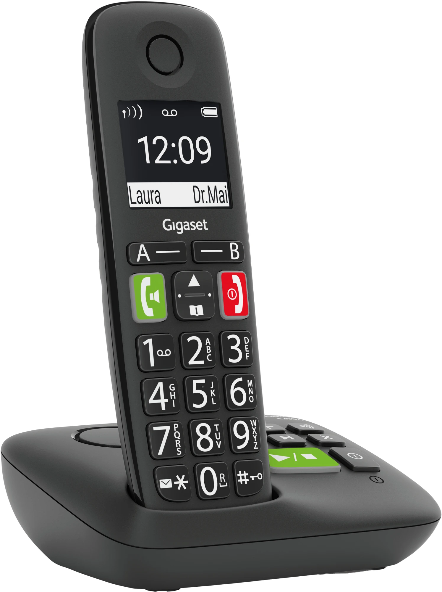 Das einfache Wählen einer Telefonnummer ist der Auftakt zu einem angenehmen Telefonerlebnis. Genau deswegen macht die ergonomische Tastatur des Großtastentelefons Gigaset E290 die Bedienung jetzt so komfortabel wie möglich: Große, beleuchtete sowie deutlich beschriftete Tasten sorgen für gute Lesbarkeit. Besonders wichtige Kontakte, zum Beispiel für den Notfall, können Sie auf einer der beiden Zielwahltasten A / B einspeichern. Wenn von dem Telefon aus nur eine Rufnummer angewählt werden soll, ist die Direktruf-Funktion hilfreich. In schwierigen Situationen reicht das Drücken einer beliebigen Taste um eine vorab hinterlegte Telefonnummer zu aktivieren.